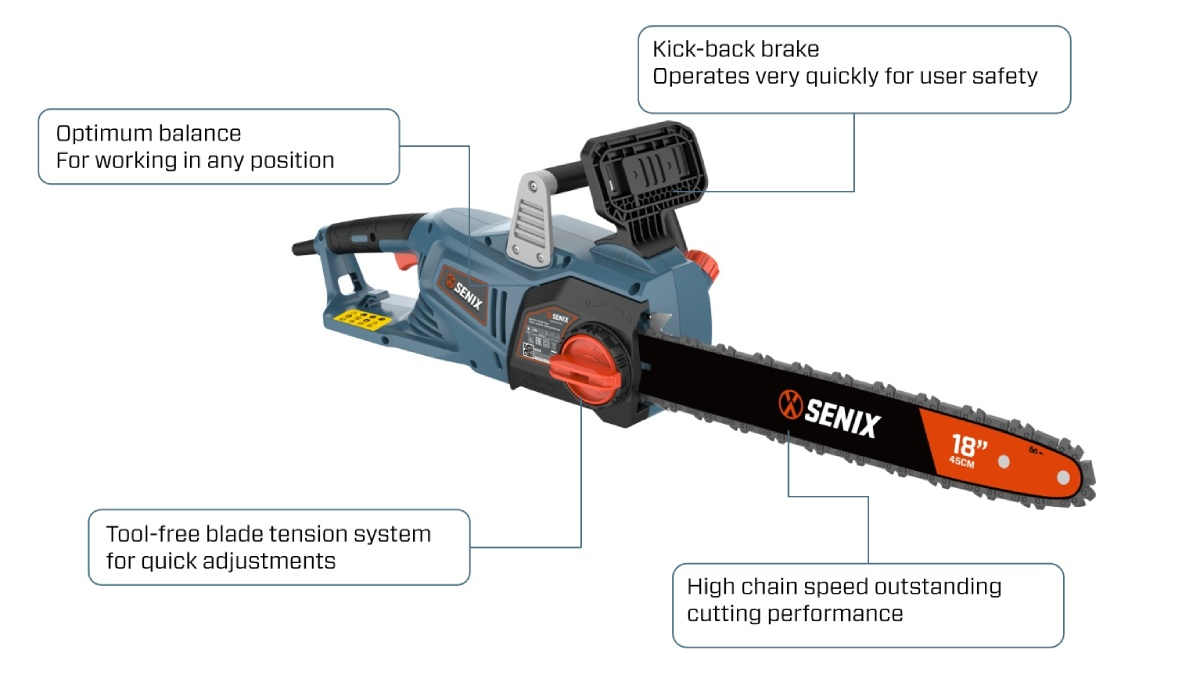 (5.0)Senix 2400W 18 "Electric Chain Saw มอบพลังการตัดระดับมืออาชีพพร้อมความปลอดภัยและความสะดวกสบายขั้นสูงซึ่งมีความเร็วสูงในโซ่สูง 16 m/s ระบบความตึงเครียดที่ปราศจากเครื่องมือและเบรกหลังเตะอย่างรวดเร็ว