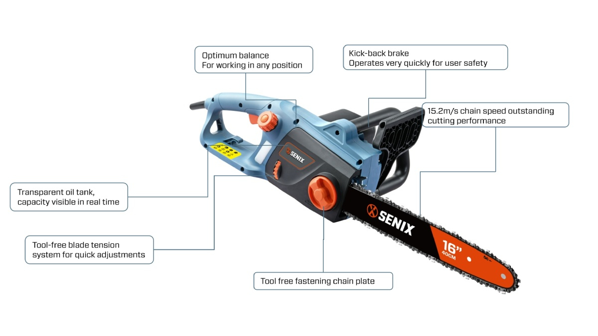 (5.0)เลื่อยโซ่ Senix 2200W 40 ซม. (16”) ให้การตัดที่มีประสิทธิภาพและแม่นยำด้วยความปลอดภัยและความสะดวกสบายความเร็วโซ่ 14.5 m/s เบรกเตะกลับและระบบความตึง SDS ที่ปราศจากเครื่องมือทำให้มั่นใจได้ว่าการใช้งานง่ายและประสิทธิภาพระดับมืออาชีพ