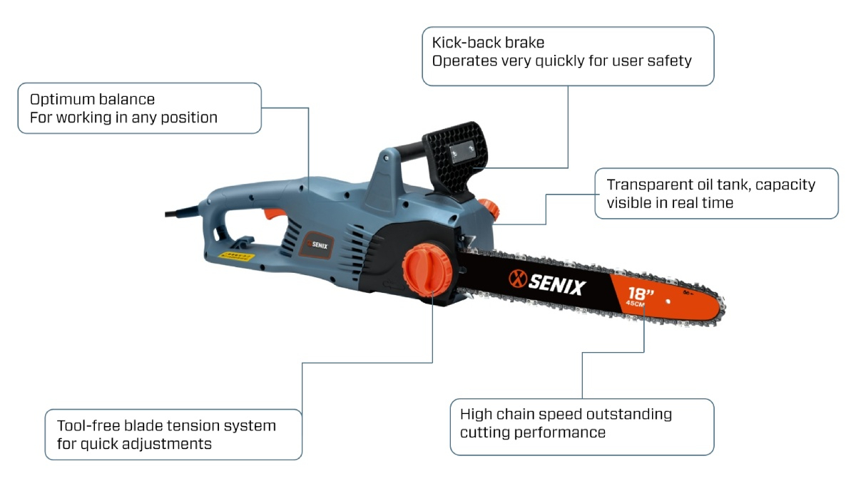 (5.0)SENIX 2200W 45 ซม. (18”) SAW โซ่ไฟฟ้าผสมผสานพลังงานความปลอดภัยและความแม่นยำสำหรับการใช้งานระดับมืออาชีพและที่บ้านซึ่งมีความเร็วสูงในโซ่สูง 14.5 m/s, การหล่อลื่นอัตโนมัติและระบบความตึงของใบมีดที่ปราศจากเครื่องมือ