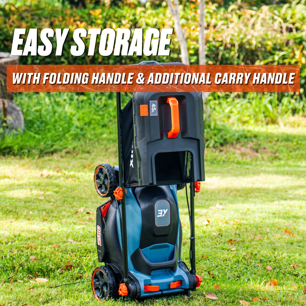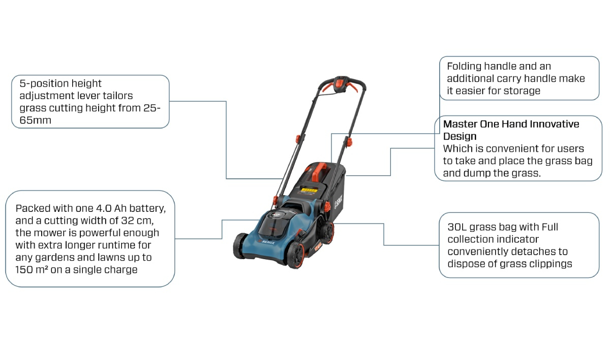 เครื่องตัดหญ้านี้มีน้ำหนักเบาและพกพาเพียง 10.0 กิโลกรัม ที่จับพับและที่จับแบบพกพาเพิ่มเติมทำให้การจัดเก็บไม่ยุ่งยาก ล้อหน้า/ด้านหลังมีขนาด 14/14 ซม. ให้การหลบหลีกที่ราบรื่นบนสนามหญ้าแบน เป็นมิตรกับสิ่งแวดล้อมและไร้สายมันหลีกเลี่ยงความยุ่งเหยิงและควันของเครื่องตัดน้ำมัน