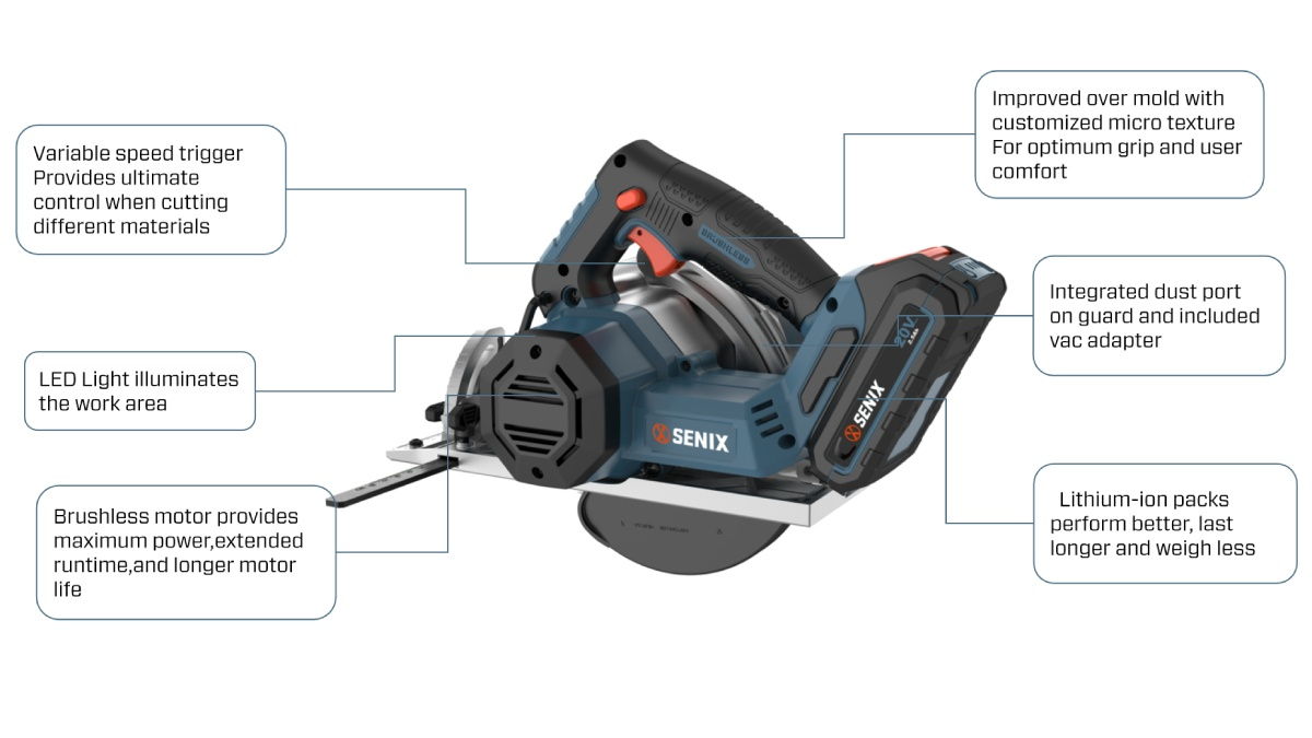 Senix 20V brushless 165 มม. เลื่อยเลื่อยได้รับการออกแบบทางวิศวกรรมเพื่อพลังงานความแม่นยำและประสิทธิภาพ - ทั้งหมดบรรจุในการออกแบบที่มีน้ำหนักเบาและไร้สาย มีมอเตอร์ไร้แปรงที่แข็งแกร่ง SAW มอบความเร็วในการตัด 5,000 รอบต่อนาทีเพื่อจัดการกับงานไม้ที่ต้องการมากที่สุดได้อย่างง่ายดาย ใบมีดขนาด 165 มม. (6-1/2 ') ช่วยให้การตัดลึกสูงสุด 65 มม. ที่ 0 °และ 42 มม. ที่มุม 45 °ทำให้คุณมีความสามารถรอบตัวสูงสุดสำหรับการวางกรอบ cabinetry และการปรับปรุงบ้าน